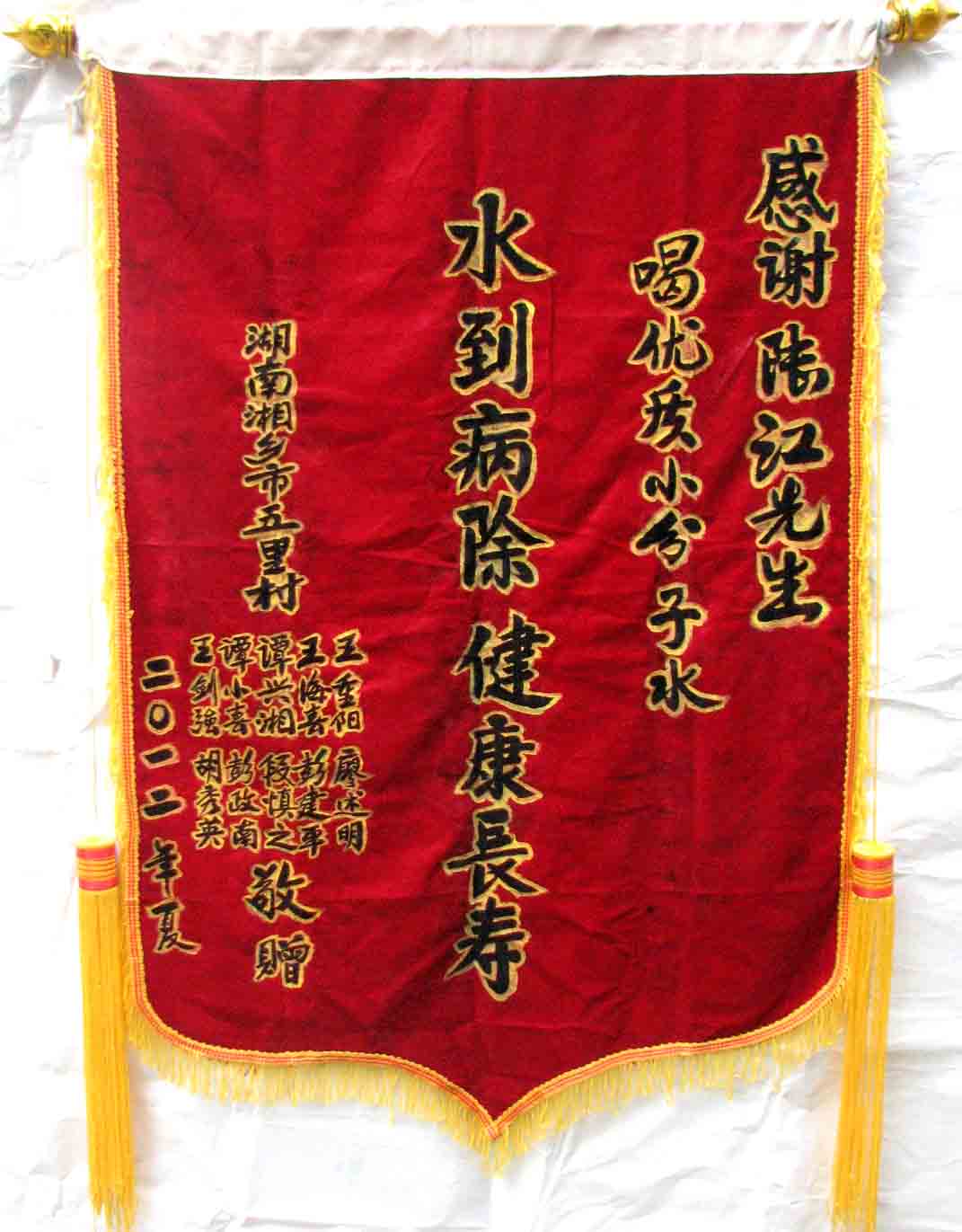 新疆63歲的賀兆生飲用一年,冠心病未愈,他用電話介紹是食堂管理員,問他食量多少?說吃七八分飽,睡前還吃兩袋牛奶,陸 江說我在論文和書中多次批判“吃七八分飽”,關照患者務必用“己饑方食”控制主食肉食量,要他把牛奶改在早中餐吃,減少主食肉食量,建議不吃晩餐,晚上只吃一個蘋果,再經幾個月補水節食,治愈了21年的冠心病和肥胖、失眠等病,信中由衷地感激陸 江為再生父母。[13]因為醫生從未過問他的膳食習慣,只管開處方藥或手術,父母也不會叫他不吃晩飯。